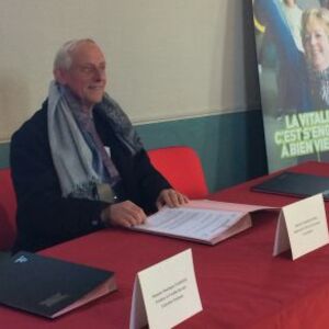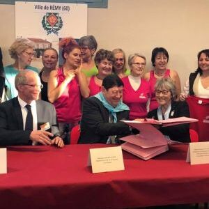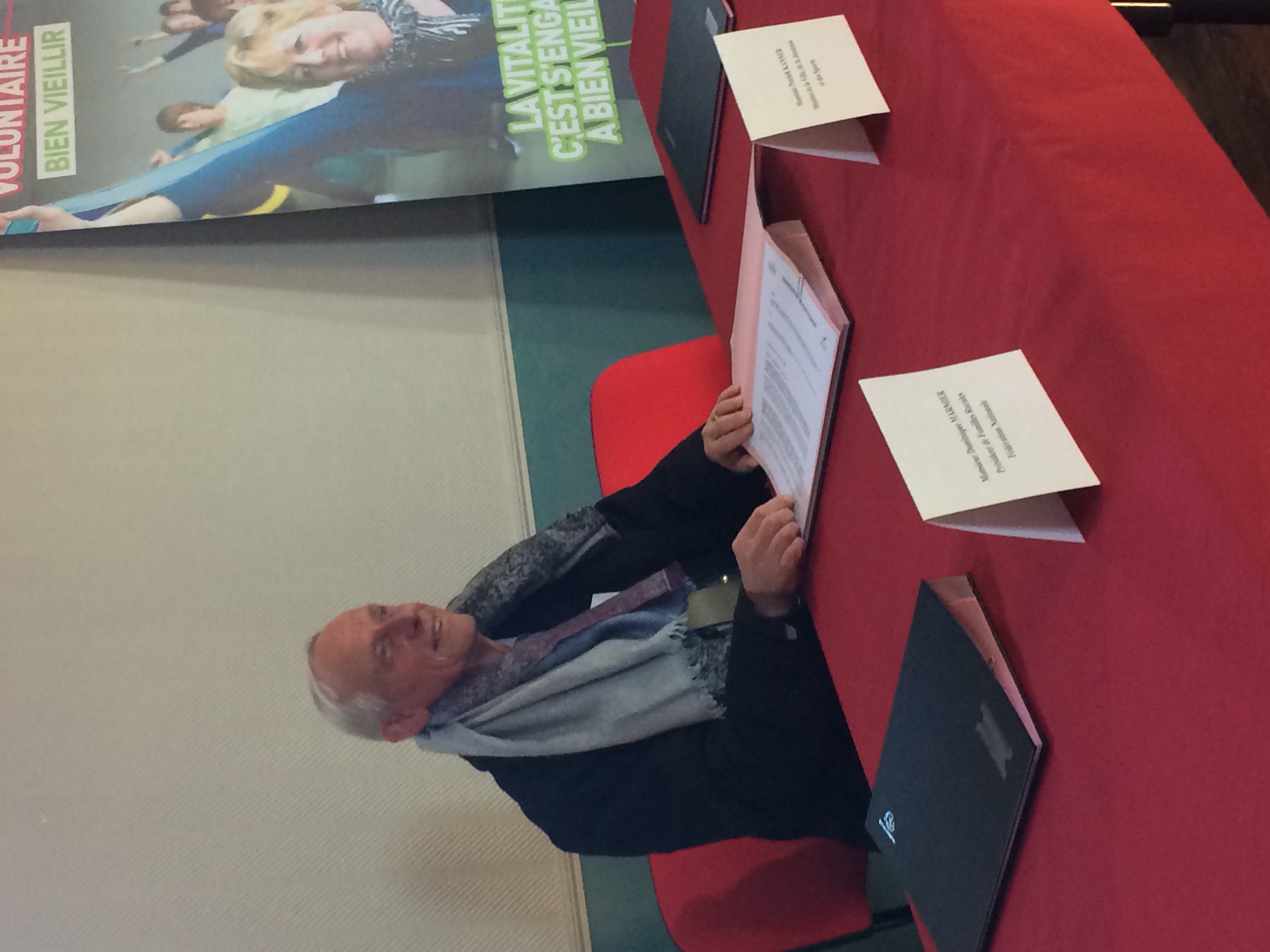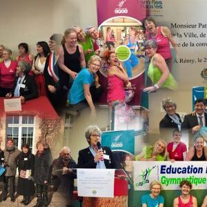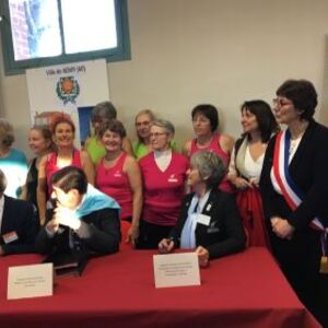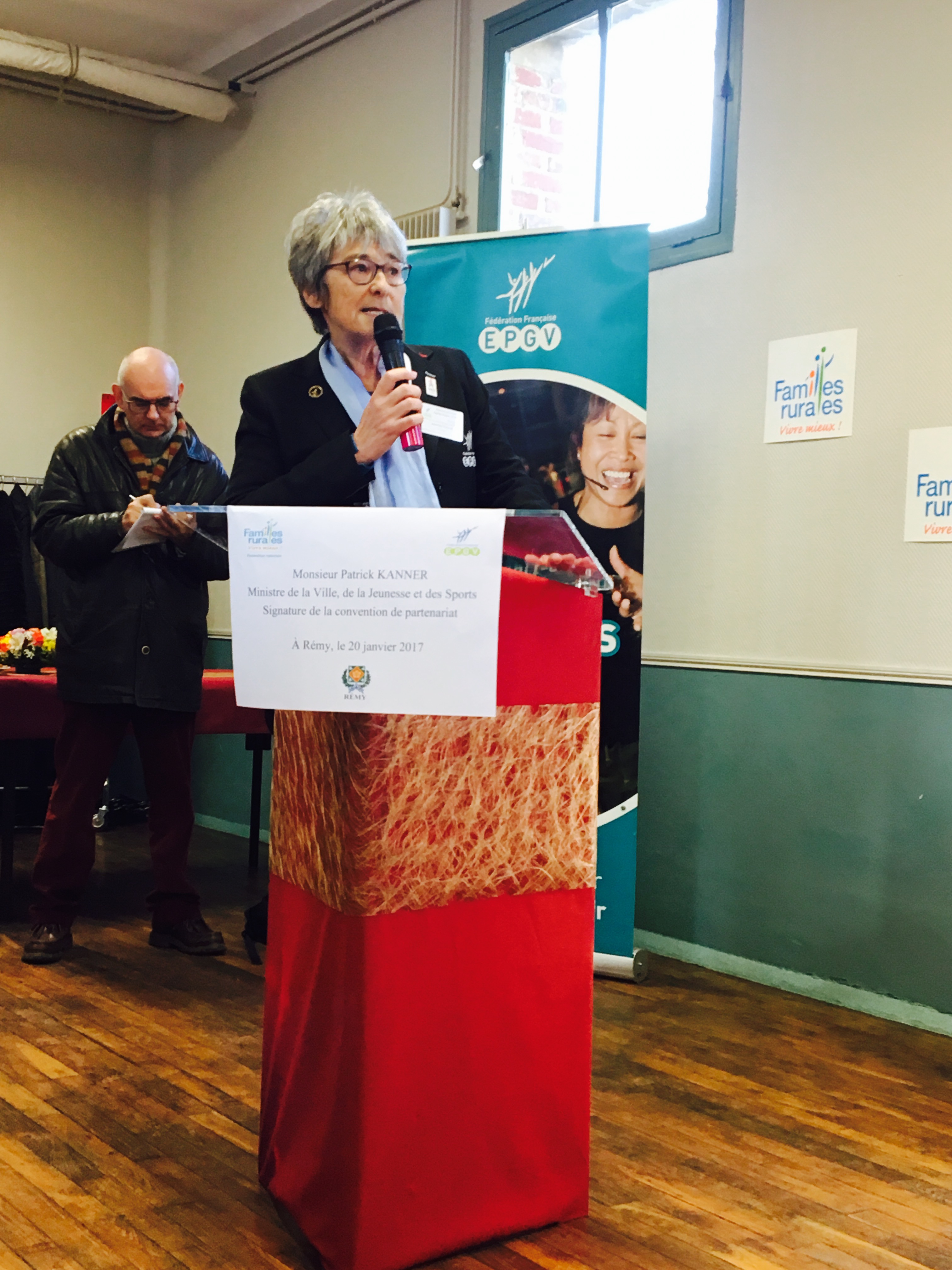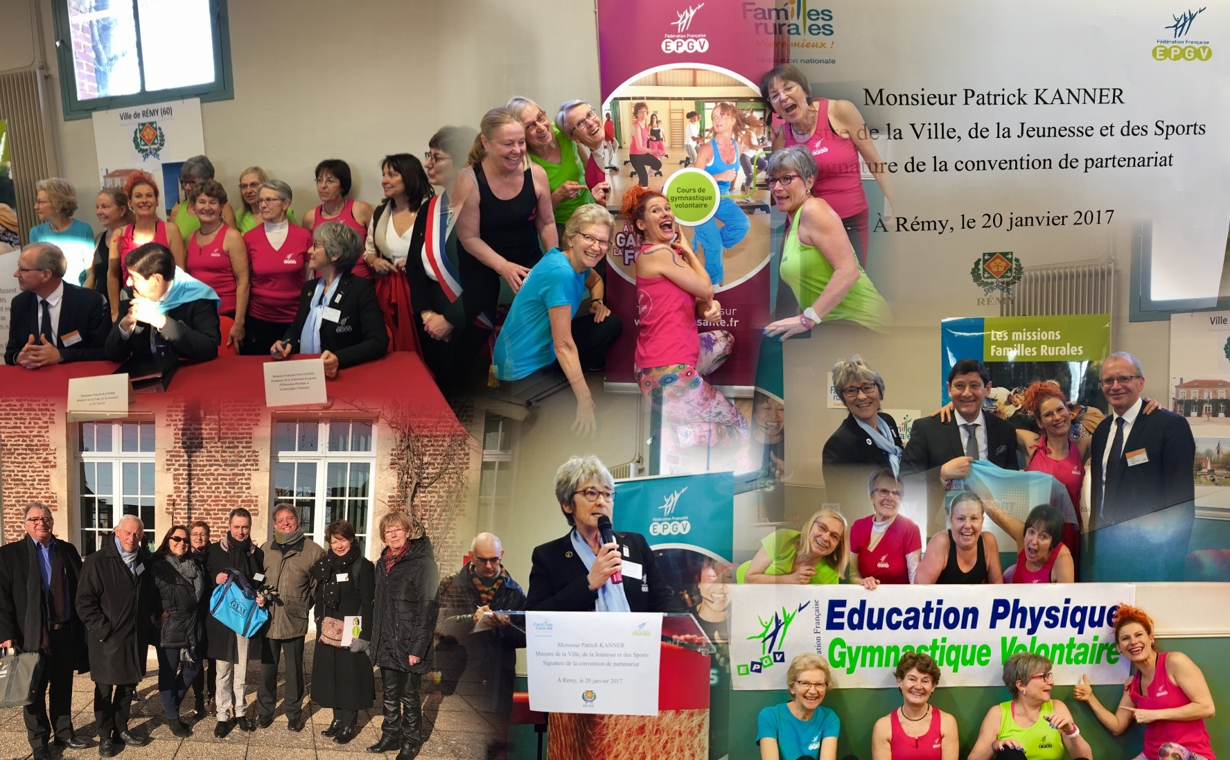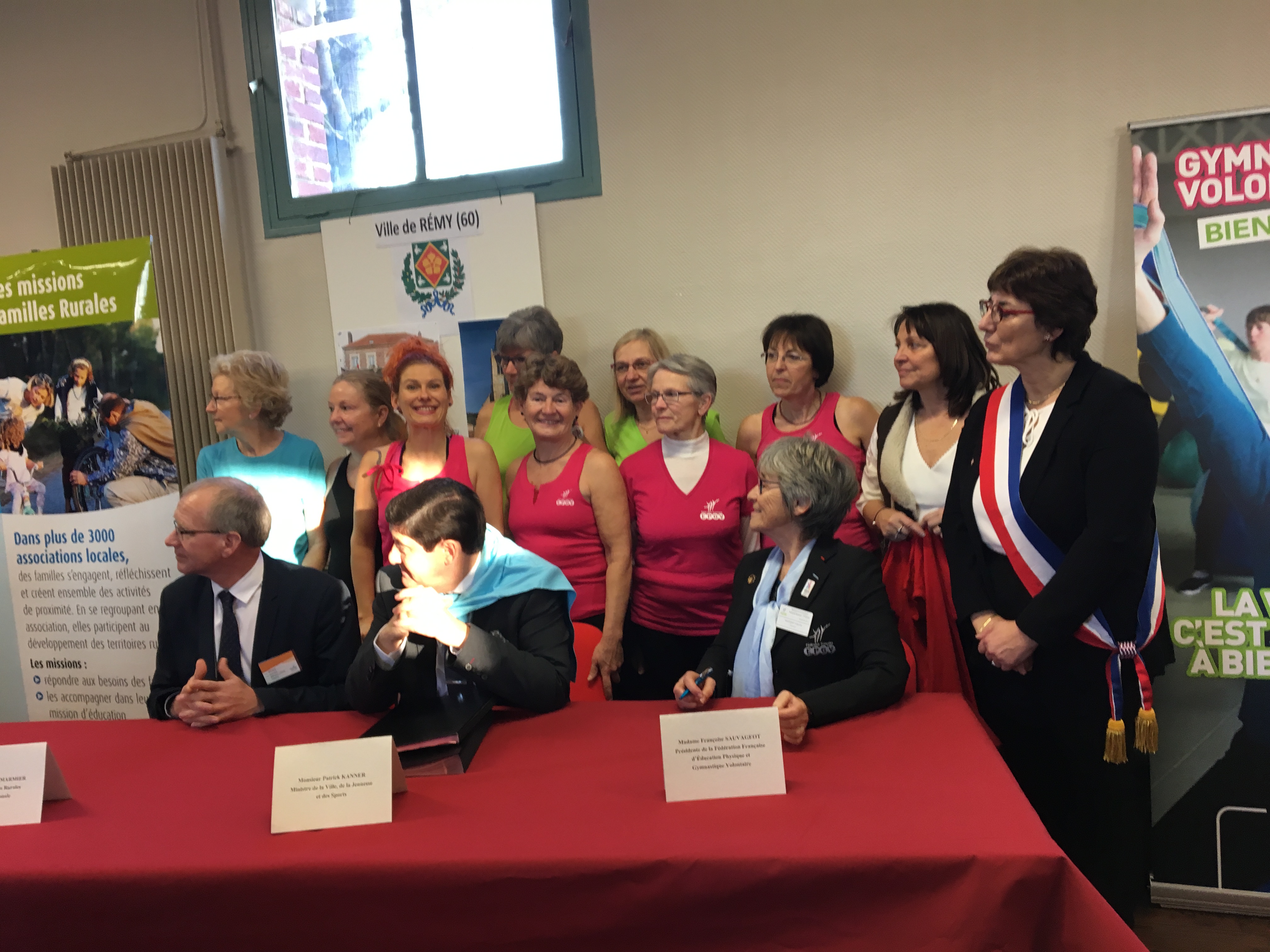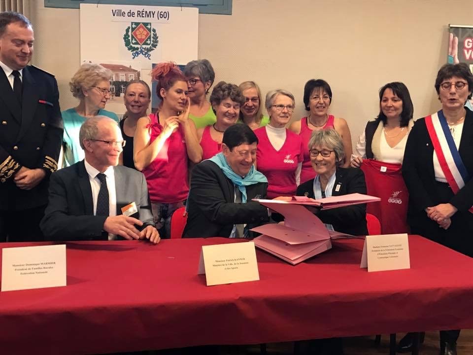 Entourés par des pratiquantes EPGV, Dominique Marmier Président de Familles Rurales et Françoise Sauvageot, Présidente de la FFEPGV viennent de signer une convention de partenariat en présence de monsieur le Ministre Patrick Kanner.
